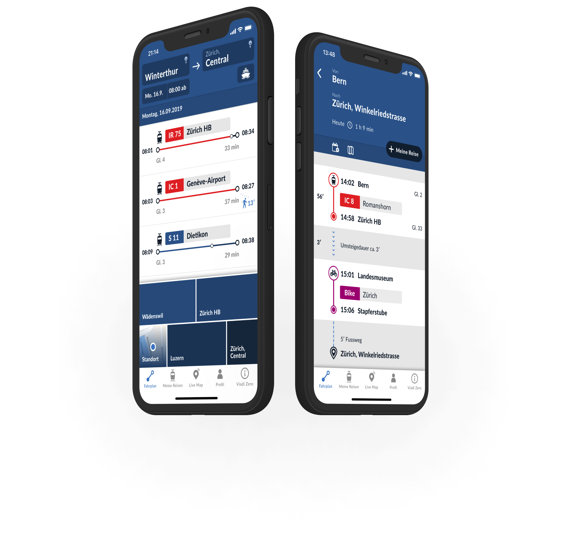Knapper Anschluss: Mit den Turnschuh-Verbindungen kommst du fix von A nach B.Mehr als ÖV: Neben dem ÖV nutzt du auch gerne mal PubliBike oder Mobility? Viadi Zero weiss, wann sich das zeitlich lohnt.